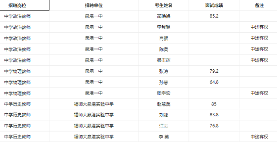 根據(jù)《2021年福建省泉州市泉港區(qū)赴高校專項公開招聘中學(xué)新任教師公告》精神,現(xiàn)將江西師范大學(xué)考點面試成績公示如下:
