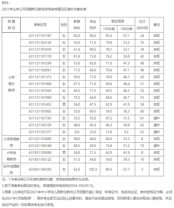 附件:2021年北岸公開招聘新任教師資格審核情況及遞補(bǔ)對(duì)象名單