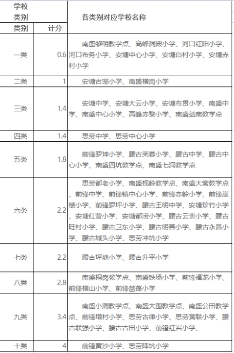 ⑶云城區(qū)邊遠地區(qū)學(xué)校任教經(jīng)歷計分辦法。對不辭勞苦,服務(wù)我區(qū)邊遠地區(qū)學(xué)校的支教教師,按《云城區(qū)邊遠地區(qū)學(xué)校教師生活補助實施辦法》(云區(qū)財〔2017〕86號)劃定的邊遠地區(qū)學(xué)校類別進行計分。各類學(xué)校量化計分見下表: