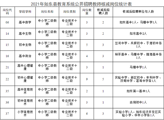 2021年如東縣教育系統(tǒng)公開招聘教師報(bào)名工作于5月22日結(jié)束。根據(jù)《2021年如東縣教育系統(tǒng)公開招聘教師公告》,下列招聘崗位因報(bào)名成功人數(shù)不足,未達(dá)到開考比例,予以核減。