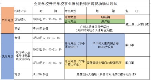 根據(jù)《2021年黃埔區(qū)教育局公開招聘會(huì)元學(xué)校、開元學(xué)校教師公告(第一批)》,廣州考點(diǎn)因防疫需要,考點(diǎn)從廣州市第二中學(xué)科學(xué)城校區(qū)調(diào)整為廣州市黃埔區(qū)開元學(xué)校。廣州考點(diǎn)現(xiàn)場確認(rèn)、武漢考點(diǎn)現(xiàn)場確認(rèn)及現(xiàn)場報(bào)名安排如下: