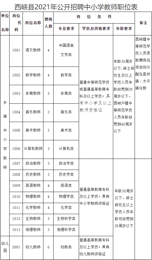 新招聘教師由教體局面向基層、面向城區(qū)以外需求教師的鄉(xiāng)鎮(zhèn)進(jìn)行分配,其中報(bào)考中小學(xué)語(yǔ)文、數(shù)學(xué)、體育、音樂(lè)、美術(shù)、計(jì)算機(jī)教師崗位的西峽籍中等師范畢業(yè)生將定向分配到桑坪或太平鎮(zhèn)。