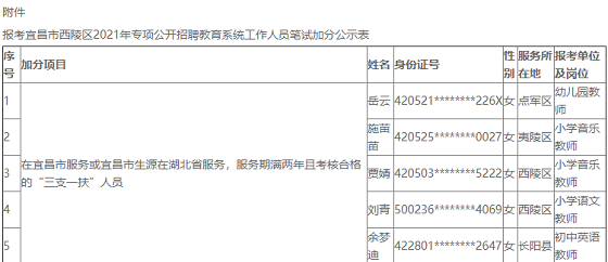 根據(jù)《宜昌市西陵區(qū)2021年公開專項(xiàng)招聘教育系統(tǒng)事業(yè)單位工作人員公告》要求,經(jīng)相關(guān)部門審核,符合加分條件的共有5人(詳見附件),現(xiàn)予公示。