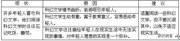 參考答案:One possible version: Why is fantasy literature so popular with young people? At present many young people like to read fantasy literature. When they read some fantasy literature, they often forget to eat and sleep. Why is fantasy literature so popular with young people? Here are some main reasons. First, the plot of fantasy literature is usually indirect and thrilling. So it can attract young people. At the same time, fantasy literature is usually lively, interesting and instructive. As a result, it can easily move young people. Besides, fantasy literature usually describes something that young people can't do in real life, so it makes up for the realization of young people's dreams.