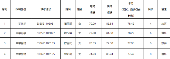 2021年6月2日,荔城區(qū)教育局組織2021年公開招聘中小學(xué)幼兒園新任教師擬入圍考生體檢,中學(xué)化學(xué)第4名黃麗娟、中學(xué)生物第6名陳寶花兩位考生缺席,選擇放棄。根據(jù)《2021年莆田市荔城區(qū)公開招聘新任教師方案》“進(jìn)入體檢、考核的人員,因體檢、考核缺席或不合格而造成招聘崗位空缺的,原則上招聘單位主管部門應(yīng)從報考該崗位進(jìn)入面試的人員中按照考試總成績由高到低確定遞補人選”之規(guī)定,確定中學(xué)化學(xué)第6名陳少敏、中學(xué)生物第8名林昕玥兩位考生予以遞補,具體如下: