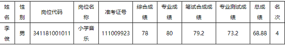 根據(jù)滁州市教育體育局、滁州市人力資源和社會保障局《關于印發(fā)2021年度滁州市中小學新任教師公開招聘實施方案的通知》(滁教體人﹝2021﹞4號)和《2021年度滁州市中小學新任教師公開招聘公告》文件精神,小學音樂崗位(崗位代碼:341181001011)總成績第二名因本人原因,主動放棄體檢,根據(jù)公告要求,現(xiàn)由第四名李俊遞補,具體信息如下: