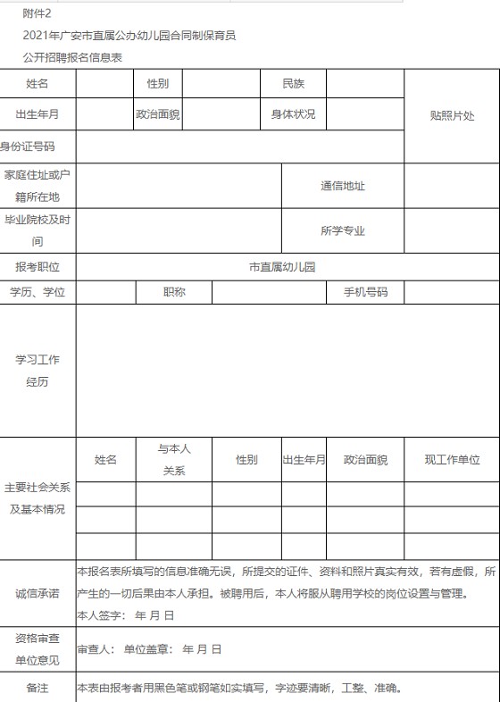 2.2021年廣安市直屬公辦幼兒園合同制保育員公開考試招聘報名信息表