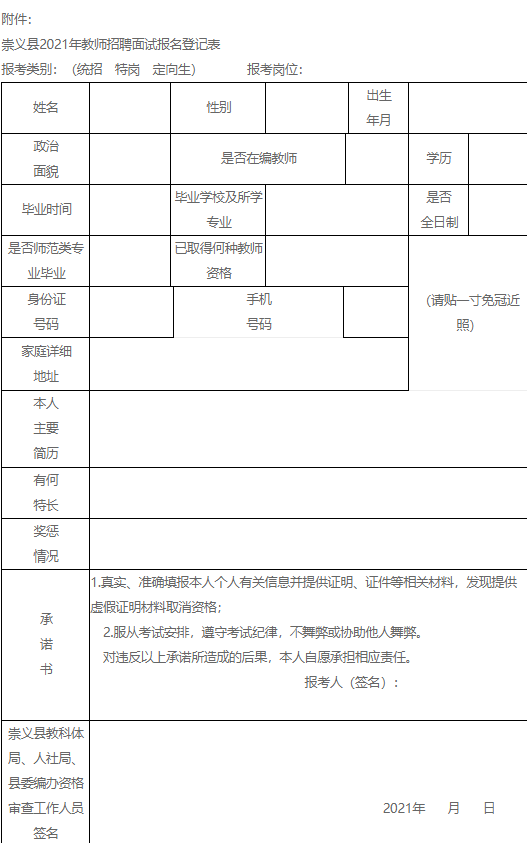 附件:崇義縣2021年教師招聘面試報(bào)名登記表