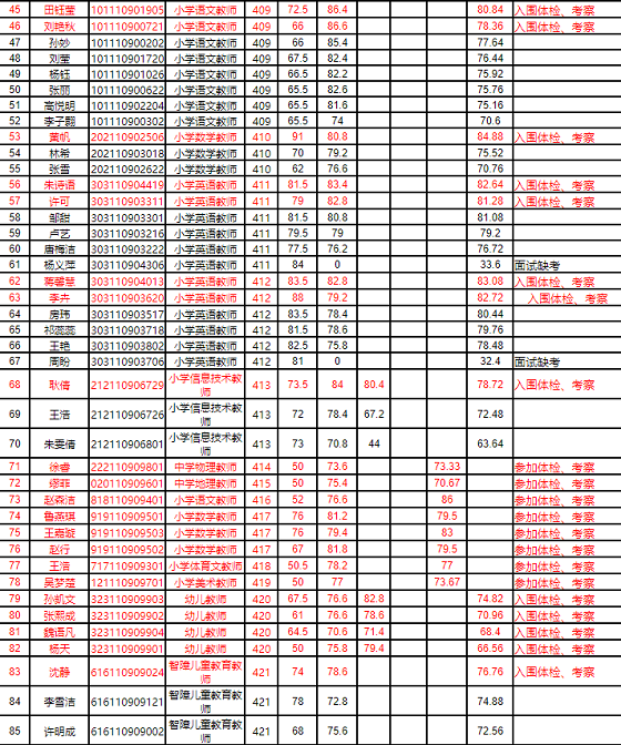 根據(jù)《丹徒區(qū)教育系統(tǒng)2021年集中公開招聘教師公告》(鎮(zhèn)徒人社事招公告[2021]2號)要求,現(xiàn)將總成績予以公布,表中紅色字體標注人員為進入體檢、考察人選。414、415、416、417、418、419崗位為鄉(xiāng)村定向師范生,因培養(yǎng)院校尚未出具綜合考核成績,總成績暫緩公布,先參加體檢、考察。入圍考生2021年6月10日(星期四)參加體檢,具體要求另行通知。