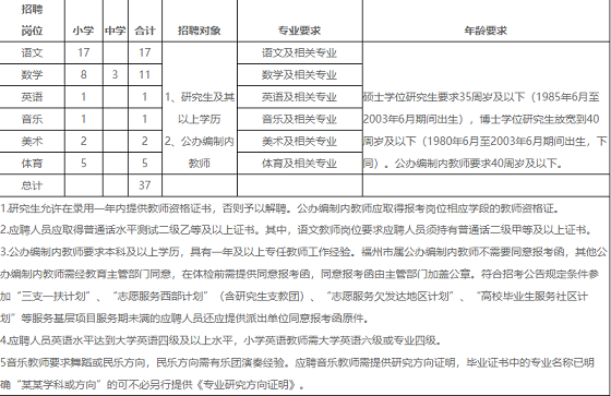 本次計(jì)劃招聘編內(nèi)教師37名。具體如下: