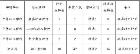 2021年青州市公開招聘教師報名繳費(fèi)工作已經(jīng)結(jié)束。據(jù)統(tǒng)計,中等職業(yè)學(xué)?叼B(yǎng)護(hù)理教師、中等職業(yè)學(xué)校工業(yè)機(jī)器人教師、中等職業(yè)學(xué)校電子商務(wù)教師和幼兒園幼兒教師D等崗位繳費(fèi)人數(shù)達(dá)不到1:3的報考比例。根據(jù)《2021年青州市公開招聘教師簡章》相關(guān)規(guī)定,招聘計劃與報名人數(shù)(以實際繳費(fèi)人數(shù)為準(zhǔn))達(dá)不到1:3的崗位,計劃聘用1人的,取消聘用計劃;計劃聘用2人及以上的,按比例相應(yīng)核減聘用計劃。具體核減情況如下: