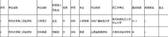 根據(jù)《2021年蘇州大學(xué)第二實(shí)驗(yàn)學(xué)校引進(jìn)事業(yè)編制(骨干)教師簡章》規(guī)定,經(jīng)公開報(bào)名、考核、考察(政審)、體檢等程序,初步確定擬錄取以下2名同志為相城區(qū)事業(yè)編制教師,現(xiàn)予以公示,公示時(shí)間為7個(gè)工作日(6月11日—6月22日)。