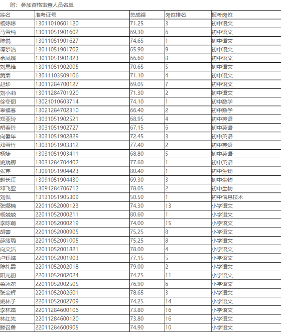 依據(jù)鄂教人函【2021】5號文件精神,面試人員名單根據(jù)筆試成績,按照學(xué)科崗位招聘計(jì)劃1:3的比例確定,崗位招聘計(jì)劃數(shù)與參加筆試人數(shù)比達(dá)不到1:3的,參加筆試人員全部參加資格審查(詳見附件:參加資格審查人員名單)。