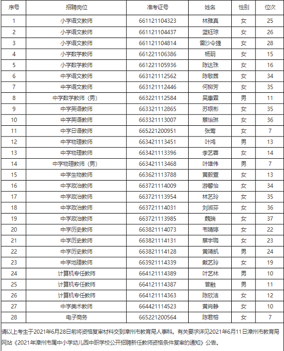 2021年漳州市屬中小學(xué)幼兒園中職學(xué)校公開招聘新任教師進(jìn)入第二批資格審核人員名單公告