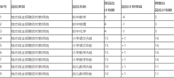 因我縣2021年農(nóng)村義務(wù)教育學(xué)校、幼兒園教師公開招聘考試中,地方自主招聘農(nóng)村教師崗初中數(shù)學(xué)、初中物理、初中化學(xué)3個崗位面試初步人選低于該崗位招聘計劃1:1比例,根據(jù)《鄖西縣2021年公開招聘農(nóng)村義務(wù)教育學(xué)校和幼兒園教師(不含新機制)公告》精神,經(jīng)研究,將以上崗位剩余招聘計劃調(diào)劑到報考人數(shù)較多的學(xué)科崗位,現(xiàn)將相關(guān)崗位計劃調(diào)整如下: