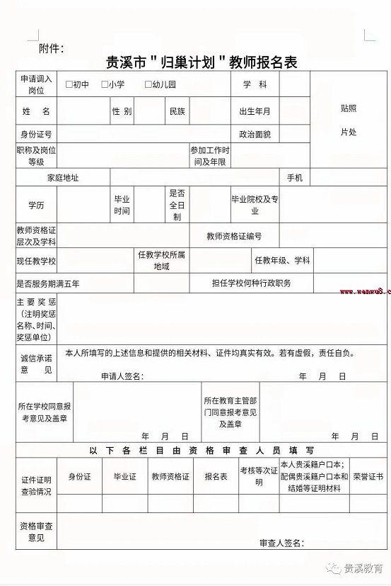 4.提交材料:報(bào)名時(shí)需要提供以下各項(xiàng)資料的原件和復(fù)印件:①身份證;②畢業(yè)證和榮譽(yù)證;③教師資格證;④貴溪市“歸巢計(jì)劃”教師報(bào)名表(見附件);⑤近五年年度考核等次證明;⑥本人貴溪籍戶口本;本人非貴溪籍但配偶為貴溪籍的須提供結(jié)婚證,配偶身份證及戶口本;本人非貴溪籍但配偶在貴溪行政事業(yè)單位(在編在崗)工作須提供結(jié)婚證,配偶單位工作證明,配偶身份證及戶口本;本人非貴溪籍但父母為貴溪籍的須提供父母身份證及戶口本、居委會(huì)(村委會(huì))證明;⑦一寸免冠照2張。按上述順序?qū)⒉牧蠌?fù)印裝訂成冊(cè),原件審閱后當(dāng)場(chǎng)退回。