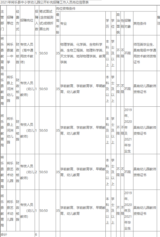 經(jīng)核準(zhǔn),本次計(jì)劃補(bǔ)充招聘中小學(xué)幼兒園新任教師6名,具體招聘崗位、招聘人數(shù)、資格條件等要求,詳見附件《2021年將樂縣中小學(xué)幼兒園公開補(bǔ)充招聘工作人員崗位信息表》。