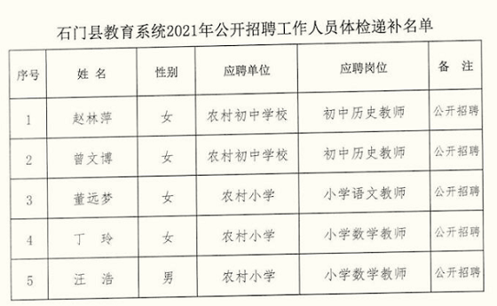一、體檢對象:見附表《石門縣教育系統(tǒng)2021年公開招聘工作人員體檢遞補名單》