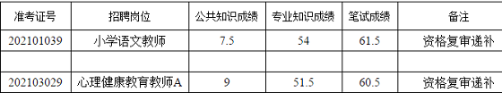 根據(jù)《常熟市2021年教育系統(tǒng)公開招聘中小學(xué)教師及職業(yè)學(xué)校專業(yè)教師公告(第三批)》規(guī)定,資格復(fù)審出現(xiàn)崗位空缺時,在報考同崗位的筆試合格人員中從高分到低分一次性遞補面試人選。請下列考生于2021年7月20日上午9:00-11:00到常熟市教師發(fā)展中心(風(fēng)和路16號)進(jìn)行資格復(fù)審,網(wǎng)上下載打印好《常熟市2021年教育系統(tǒng)招聘教師報名表》,資格復(fù)審時帶到現(xiàn)場,并隨帶有關(guān)材料原件和復(fù)印件(具體資格復(fù)審所需提供材料見《常熟市2021年教育系統(tǒng)公開招聘中小學(xué)教師及職業(yè)學(xué)校專業(yè)教師公告(第三批)》),逾期未參加資格復(fù)審視作自動放棄。
