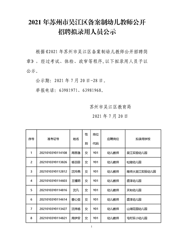 2021年蘇州市吳江區(qū)備案制幼兒教師公開(kāi)招聘擬錄用人員公示