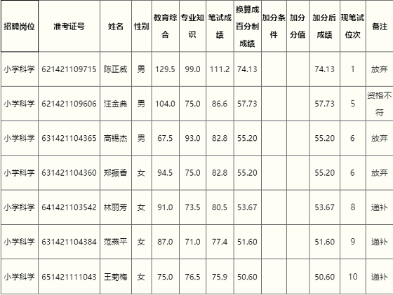 現(xiàn)將2021年7月21日新任教師補(bǔ)充招聘擬參加面試對(duì)象資格復(fù)核放棄及遞補(bǔ)對(duì)象公布如下,請(qǐng)遞補(bǔ)對(duì)象于7月21日下午3:00持相關(guān)材料到區(qū)教育局組織人事股(908室)進(jìn)行資格復(fù)核,逾期視為自動(dòng)放棄。面試資格審核提交材料及要求詳見(jiàn)荔城區(qū)人民政府教育專欄公告公示欄7月20日發(fā)布的《2021年荔城區(qū)新任教師補(bǔ)充招聘面試等有關(guān)事項(xiàng)通知》。