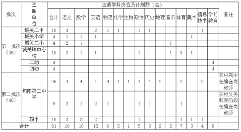 共選調(diào)81名教師,選調(diào)學(xué)科崗位及計(jì)劃數(shù)詳見下表。