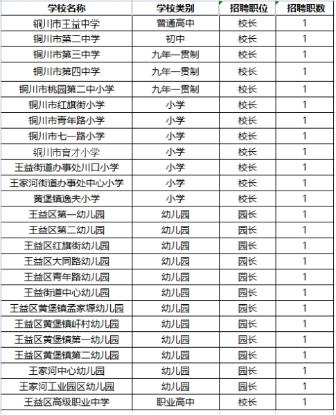 上述25所學(xué)校校長、幼兒園園長面向市域外或王益區(qū)屬學(xué)校范圍內(nèi)招聘。