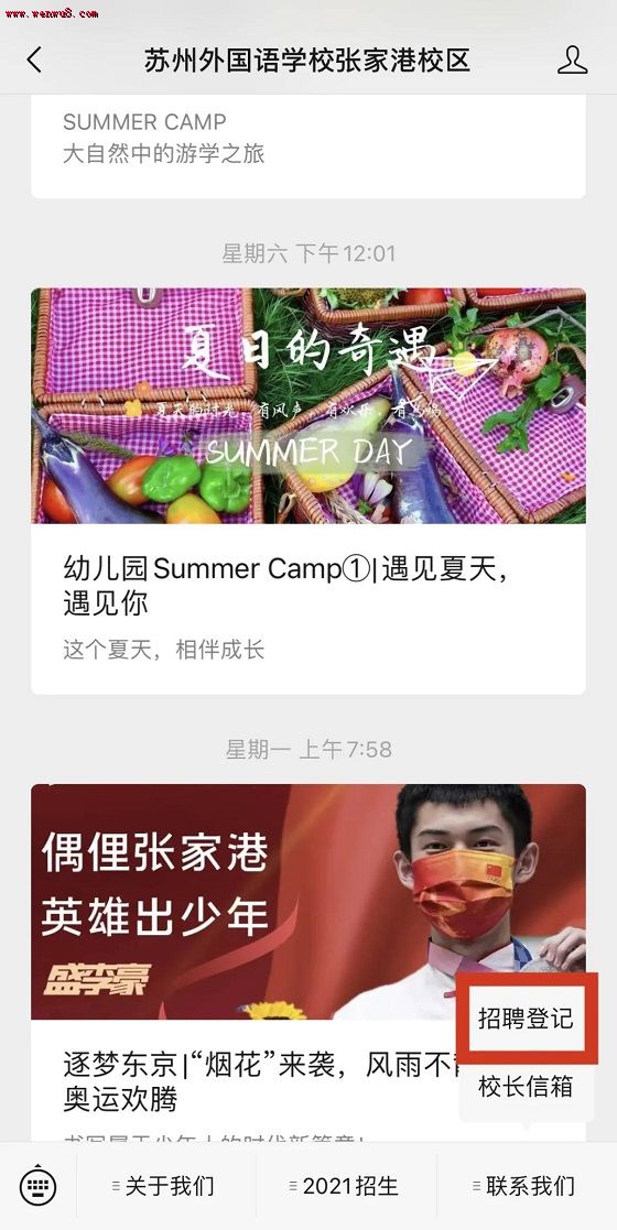 可關(guān)注公眾號“蘇州外國語學(xué)校張家港校區(qū)”,點擊右下角“聯(lián)系我們”,再點擊“招聘登記”,填寫招聘表格。