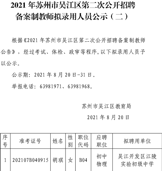 2021年江蘇蘇州市吳江區(qū)第二次公開招聘?jìng)浒钢平處煍M錄用人員公示(二)