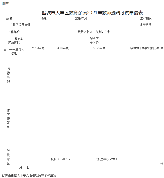 附件:1.鹽城市大豐區(qū)教育系統(tǒng)2021年教師選調(diào)考試申請表