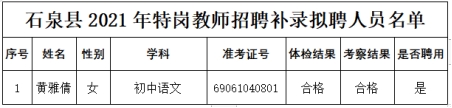 根據(jù)市委編辦、市教體局、人社局、財(cái)政局、醫(yī)保局《關(guān)于做好2021年農(nóng)村義務(wù)教育階段學(xué)校教師特設(shè)崗位計(jì)劃實(shí)施工作的通知》(安教體發(fā)〔2021〕30號)和《2021年石泉縣農(nóng)村義務(wù)教育階段學(xué)校特設(shè)崗位計(jì)劃教師招聘公告》要求,經(jīng)安康市特崗辦同意,我縣按照計(jì)劃調(diào)劑的方式進(jìn)行補(bǔ)錄,并對補(bǔ)錄人員進(jìn)行了體檢和考察,現(xiàn)將石泉縣2021年特崗教師招聘補(bǔ)錄擬聘用人員名單進(jìn)行公示。公示期為五個(gè)工作日,公示期間,如有異議,請及時(shí)反饋。