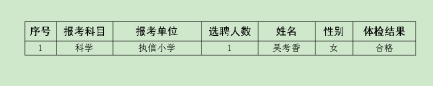 根據《廣東省事業(yè)單位公開招聘人員體檢實施細則(試行)》《關于調整廣東省事業(yè)單位公開招聘教師崗位人員體檢標準的通知》及《廣東省韶關市湞江區(qū)2020年公開選聘小學教師及校醫(yī)工作的公告》等有關規(guī)定,現將湞江區(qū)2020年公開選聘教師及校醫(yī)入圍體檢人員體檢結果(第三批)合格的考生名單(共1人)公告如下: