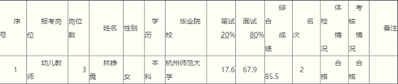 根據(jù)事業(yè)單位公開(kāi)招聘人員有關(guān)規(guī)定和《福建省龍巖市市屬中小學(xué)幼兒園2021年教育類(lèi)引進(jìn)生及優(yōu)秀高校畢業(yè)生專(zhuān)項(xiàng)招聘面試公告》,經(jīng)報(bào)名、資格審查、筆試、面試、體檢和考核等程序,確定林錚霓等1位同志為擬聘用人選,現(xiàn)予以公示如下: