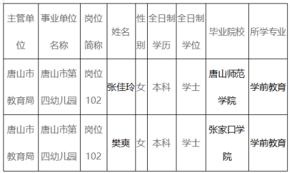 按照《河北省事業(yè)單位公開招聘工作人員暫行辦法》(冀人社發(fā)〔2011〕9號)規(guī)定,現(xiàn)對唐山市第四幼兒園擬聘用人員張佳玲等2人予以公示。