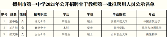 根據(jù)事業(yè)單位公開招聘有關(guān)規(guī)定和《德州市第一中學(xué)2021年公開招聘骨干教師簡(jiǎn)章》的要求,按照崗位招聘計(jì)劃,經(jīng)過公開招聘報(bào)名、初試、復(fù)試、考察、體檢等工作,現(xiàn)對(duì)該單位擬聘用人員予以公示。公示期為7個(gè)工作日,自2021年9月6日至2021年9月14日(不含節(jié)假日)。公示期間,如對(duì)公示人選有異議,請(qǐng)及時(shí)向市事業(yè)單位公開招聘主管機(jī)關(guān)反映。