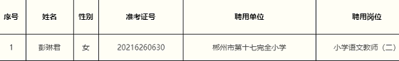 根據(jù)《2021年郴州市北湖區(qū)公開招聘教師公告》,經(jīng)報(bào)名、資格審查、筆試、面試、體檢、考察、選崗、集體研究等程序,擬同意郴州市第十七完全小學(xué)聘用彭琳君同志(擬聘用人員基本情況見下表),F(xiàn)予以公示,公示期為7個(gè)工作日(2021年9月10日至9月18日)。