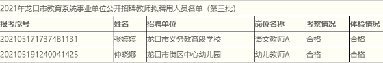 按照《2021年龍口市教育系統(tǒng)事業(yè)單位公開招聘教師簡章》規(guī)定,張婷婷、仲曉娜被確定為龍口市教育系統(tǒng)事業(yè)單位教師擬聘用人員,現(xiàn)公示如下,公示期為7個工作日(名單附后)。公示期間如有異議,請與龍口市教育和體育局聯(lián)系。