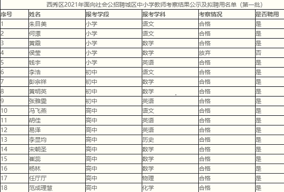 附件:西秀區(qū)2021年面向社會公招聘城區(qū)中小學教師考察結果公示及擬聘用名單(第一批)