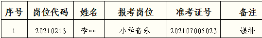因小學音樂崗位(崗位代碼:20210213)的考生(準考證號:202107039001)未能在辦理擬錄用職位的聘用手續(xù)時提供教師資格證書,根據(jù)《人力資源社會保障部辦公廳教育部辦公廳關(guān)于做好2021年中小學幼兒園教師公開招聘工作的通知》(人社廳發(fā)〔2021〕27號)、《韶關(guān)市湞江區(qū)2021年“丹霞英才”教育教學類暨中小學、幼兒園教師公開招聘公告》規(guī)定,按照本次公開招聘考試總成績順序遞補的原則,確定同一崗位的李**(準考證號:202107005023)考生為遞補體檢對象。具體遞補崗位及名單如下: