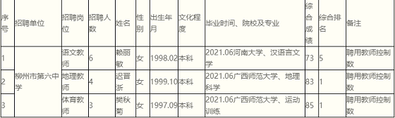 根據(jù)《柳州市第六中學2021年公開招聘高校畢業(yè)生(雙向選擇)簡章》要求及安排,賴麗敏等3名同志經(jīng)筆試、面試、考核、體檢合格,符合聘用條件。經(jīng)研究決定,擬聘用賴麗敏等3名同志為我校教師,現(xiàn)予以公示,公示期7個工作日(2021年9月7日至2021年9月15日)。對擬聘用的同志如有異議,請以書面形式,并署真實姓名和聯(lián)系地址,于2021年9月15日前郵寄或直接送我單位(郵寄地址為:柳州市柳石路3號;郵編:545005,電話0772-3834622),群眾如實反映有關問題受法律保護。