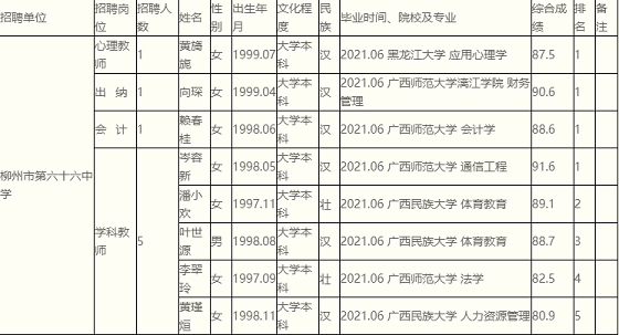 根據(jù)《柳州市第六十六中學(xué)公開招聘高校畢業(yè)生(雙向選擇)公告》要求及安排,黃旖旎等8名同志經(jīng)筆試、面試、考核、體檢合格,符合聘用條件。經(jīng)研究決定,擬聘用黃旖旎等8名同志為我單位工作人員,現(xiàn)予以公示,公示期7個(gè)工作日(2021年9月10日至2021年9月18日)。對(duì)擬聘用的同志如有異議,請(qǐng)以書面形式,并署真實(shí)姓名和聯(lián)系地址,于2021年9月18日前郵寄或直接送我單位(郵寄地址為:柳州市柳江區(qū)成團(tuán)鎮(zhèn)柳州市第六十六中學(xué)黨政辦;郵編:545103,電話0772-7205766),群眾如實(shí)反映有關(guān)問題受法律保護(hù)。