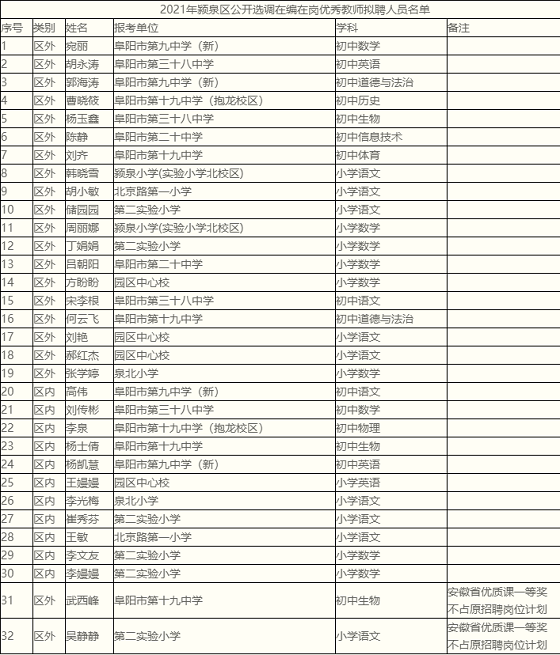 附件、2021年潁泉區(qū)公開選調(diào)在編在崗優(yōu)秀教師擬聘人員名單