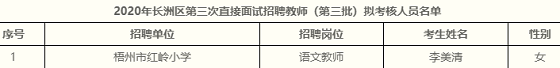 根據(jù)《自治區(qū)教育廳自治區(qū)人力資源社會保障廳自治區(qū)黨委編辦印發(fā)〈中小學(xué)教師公開招聘改革指導(dǎo)意見〉的通知》(桂教規(guī)范〔2019〕19號)、《梧州市事業(yè)單位公開招聘人員實施細則》(梧政發(fā)〔2012〕52號)和《長洲區(qū)2020年面向高校直接面試招聘教師簡章》文件要求,經(jīng)過自愿報考、資格審查、面試等程序。擬李美清同志進入考核、體檢程序,現(xiàn)予以公示(名單見附表)。公示時間2021年9月14日—9月20日,共7天。在公示期間,如果對擬進入考核、體檢的人員考核、體檢資格有異議,請以書面形式署真實的姓名和聯(lián)系方式,于2021年7月20日之前以郵寄或直接送達長洲區(qū)教育局人事股(直接送的以送達日期為準;郵寄的以郵戳日期為準)。郵政編碼543000,聯(lián)系電話0774—3823823。