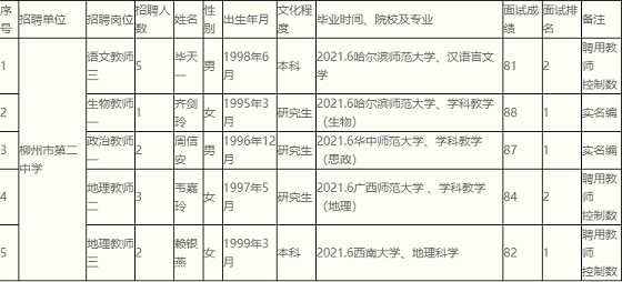 根據(jù)《柳州市教育系統(tǒng)2021年度公開招聘工作人員公告》要求,畢天一等5名同志經(jīng)面試、考核、體檢合格,符合聘用條件。經(jīng)研究決定,擬聘畢天一等5名同志為我單位工作人員,現(xiàn)予以公示,公示期7個工作日(2021年9月15日-2021年9月24日),對擬聘用的同如有異議,請以書面形式,并署真實姓名和聯(lián)系地址,于2021年9月25日前郵寄或直接送我單位(郵寄地址為:柳州市魚峰區(qū)文苑路18號;郵編:545000,電話:0772-2456302),群眾如實反映有關問題受法律保護。