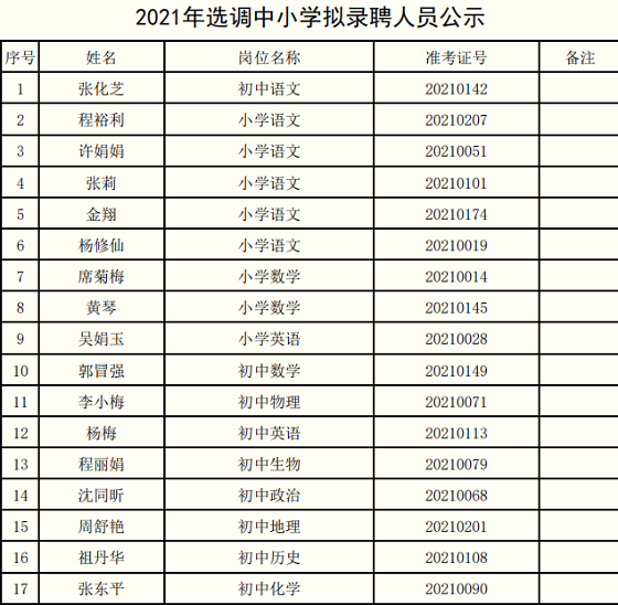 根據(jù)《合肥市包河區(qū)2021年選調(diào)中小學(xué)教師公告》規(guī)定,通過筆試、面試、體檢、考察等環(huán)節(jié),以下17人為本次招聘擬錄聘人員(具體名單見附表),現(xiàn)面向社會公示,公示時(shí)間2021年9月13日至2021年9月17日。