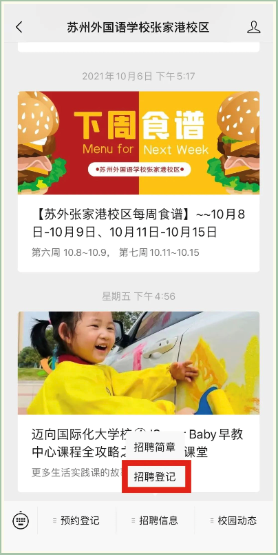關(guān)注公眾號(hào)“蘇州外國(guó)語(yǔ)學(xué)校張家港校區(qū)”,點(diǎn)擊菜單欄“招聘信息”,點(diǎn)擊“招聘登記”,填寫招聘表格。