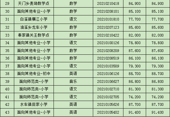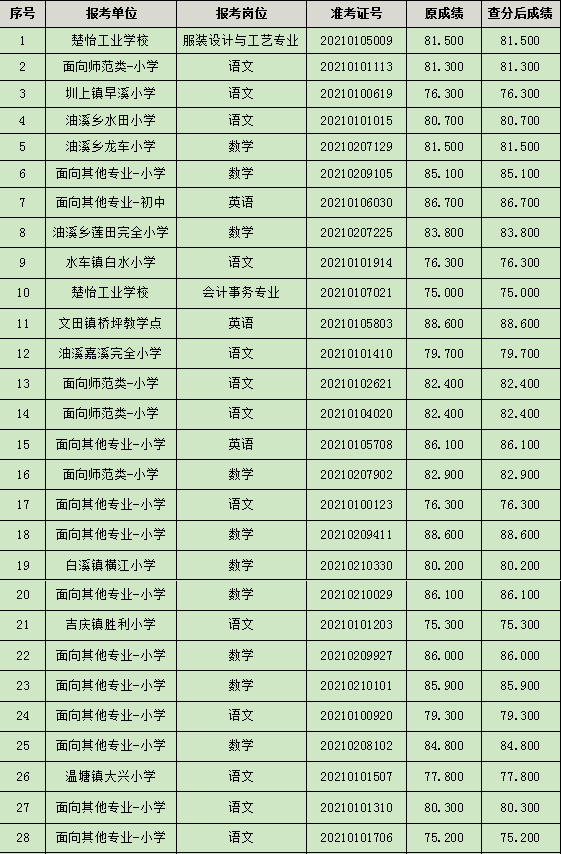 我縣教育系統(tǒng)2021年面向社會公開招聘教師筆試成績公示后,在規(guī)定時間內(nèi),共有43名考生申請查分,經(jīng)復(fù)核考生的試卷分?jǐn)?shù),現(xiàn)將查分結(jié)果予以公示。