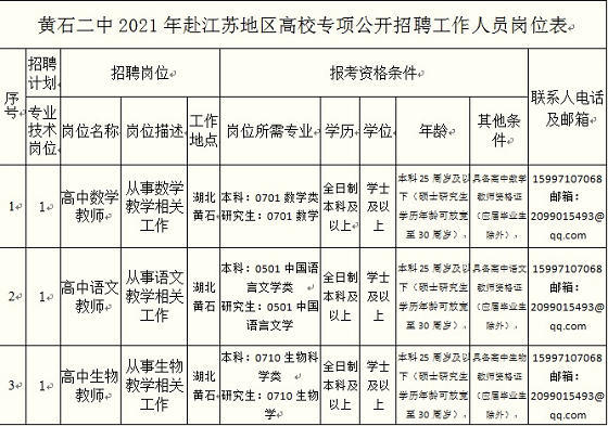 報(bào)名方式:應(yīng)聘人員按照《黃石二中2021年赴江蘇地區(qū)高校專項(xiàng)公開招聘工作人員崗位表》的聯(lián)系方式,通過電子郵箱報(bào)名,并及時(shí)電話聯(lián)系確認(rèn)收妥。