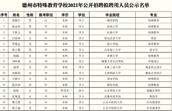根據(jù)事業(yè)單位公開招聘有關(guān)規(guī)定和《2021年德州市特殊教育學(xué)校公開招聘教師簡章》的要求,按照崗位招聘計(jì)劃,經(jīng)過公開招聘報(bào)名、筆試、面試、考察、體檢等工作,現(xiàn)對該單位擬聘用人員予以公示,公示期為7個(gè)工作日。公示期間,如對公示人選有異議,請及時(shí)向市事業(yè)單位人事綜合管理部門反映。