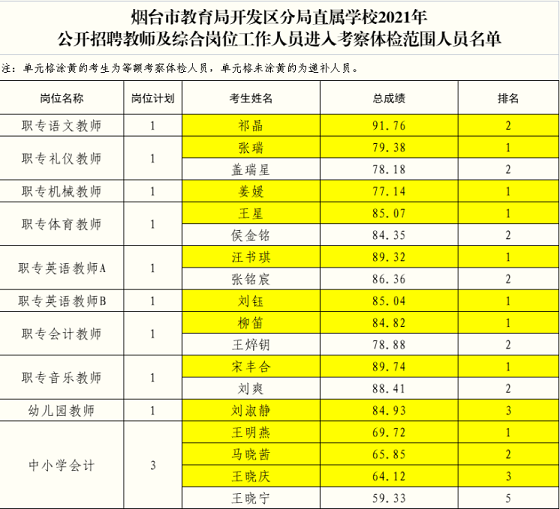 根據(jù)《煙臺市教育局開發(fā)區(qū)分局直屬學(xué)校2021年公開招聘教師及綜合崗位工作人員簡章》規(guī)定,現(xiàn)公布進入考察體檢范圍人員名單(詳見附件)如下。
